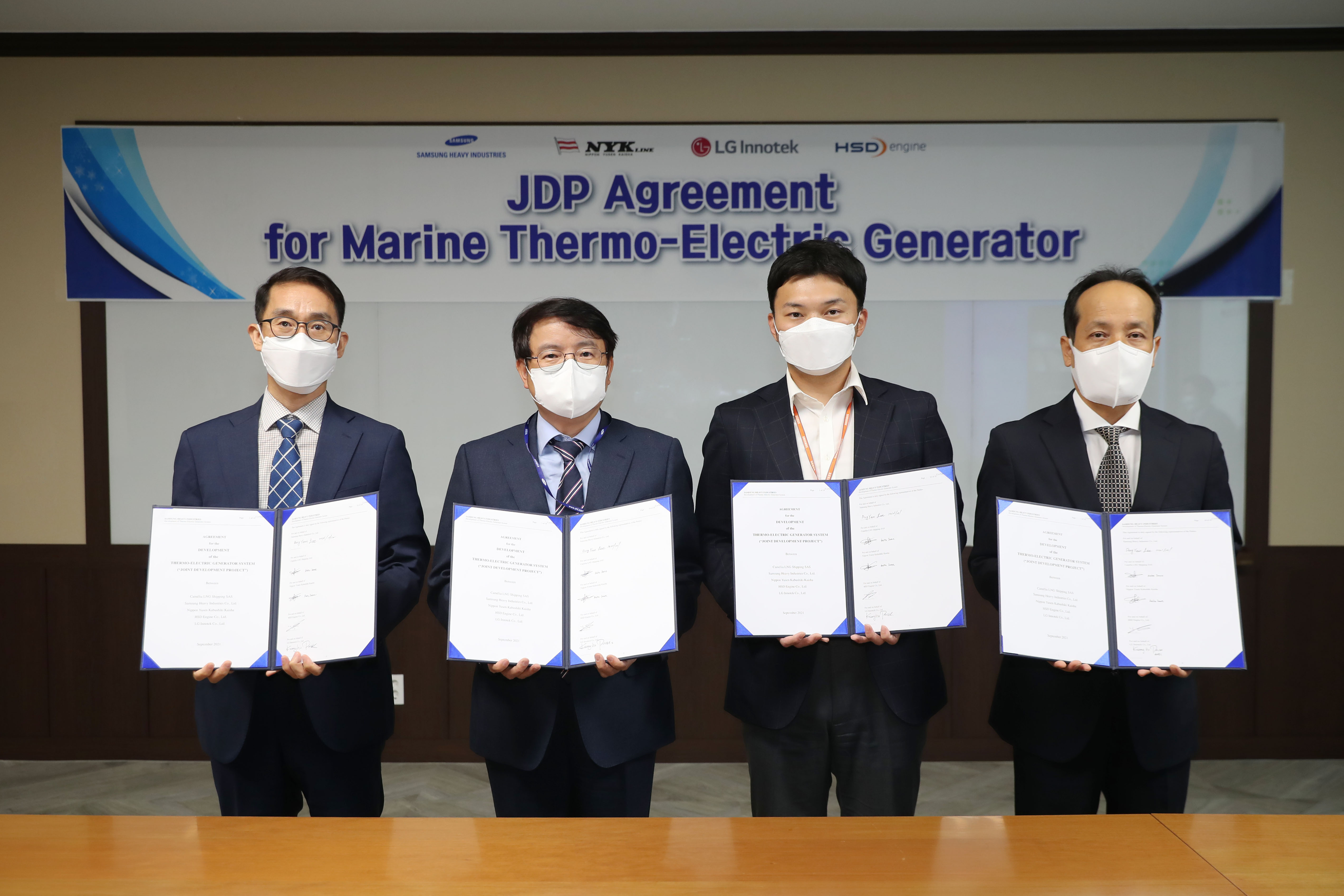 삼성重, 세계최초 열전발전 탑재 LNG船사진 왼쪽부터 박광호 LG이노텍 소자소재연구소장 , 이동연 삼성중공업 조선해양연구소장, 케이타이노우에 NYK 호선 담당 (KEITA INOUE NYK Representative), 최종태 HSD엔진 기술 담당 만든다
