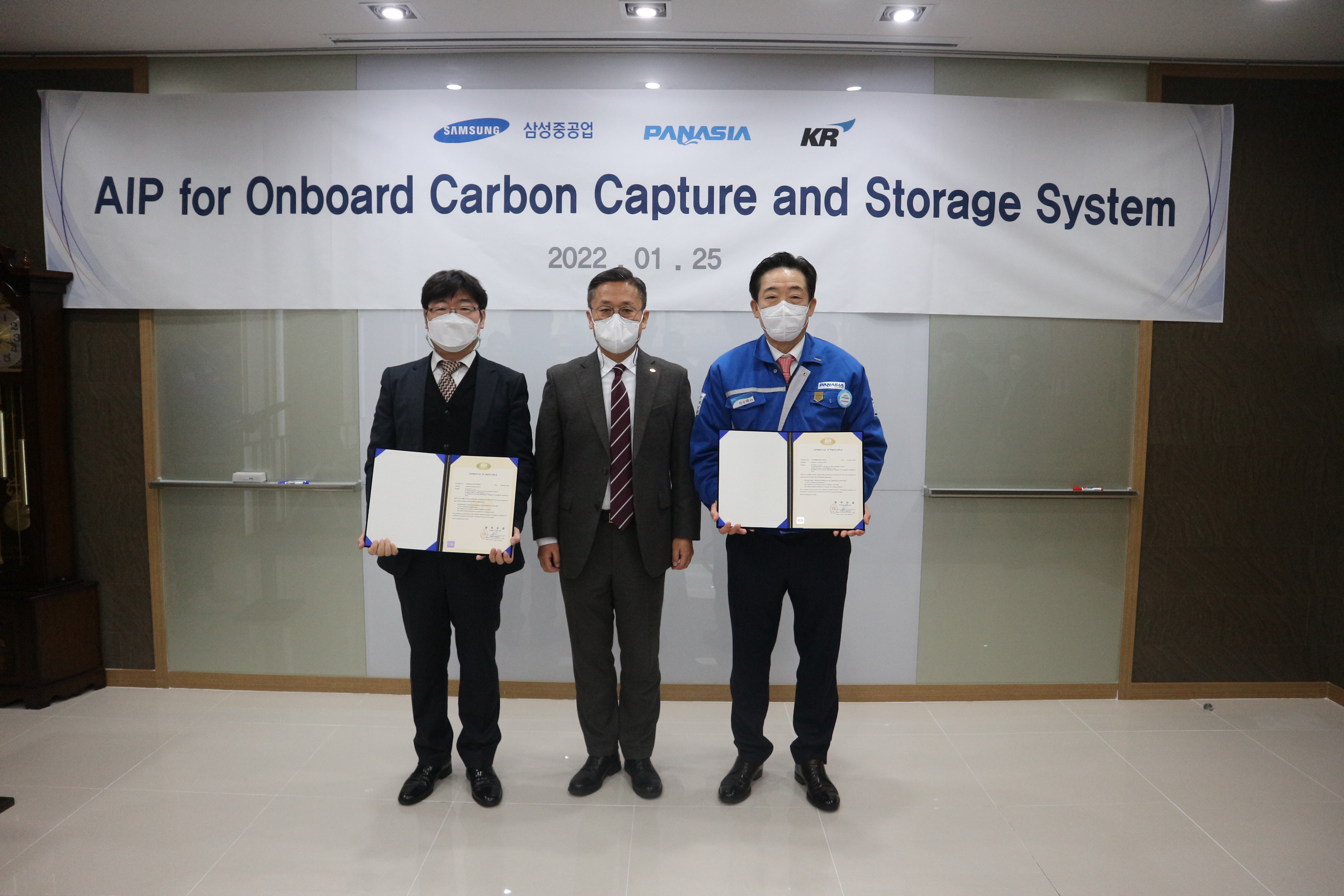 사진설명 : 선박 탄소포집 기술 선급 인증 수여식 / (중앙) KR 김대헌 연구본부 본부장, (좌) 박건일 센터장, (우) 파나시아 이수태 회장