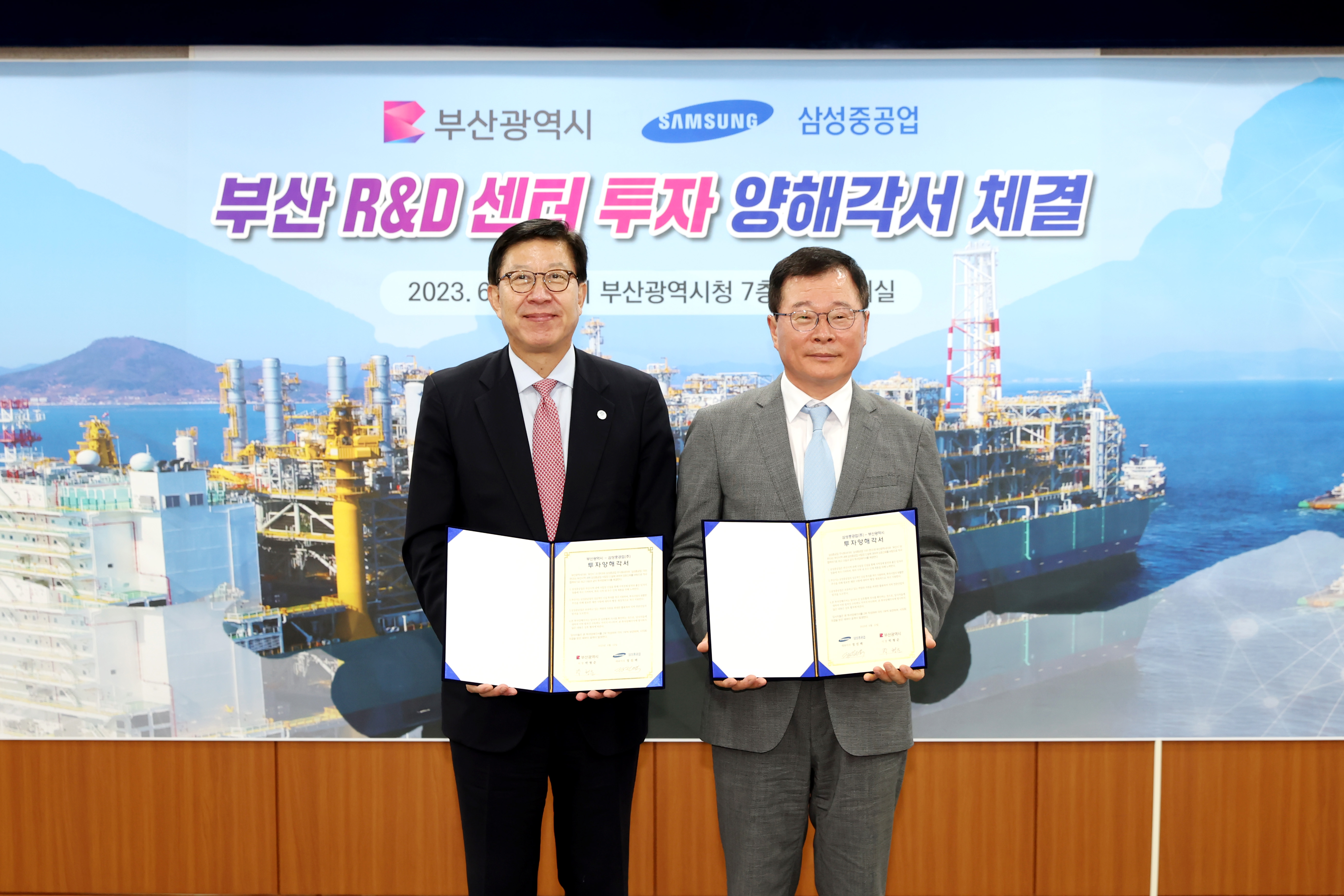 삼성중공업은 부산시와 (가칭)'부산 R&D 센터' 설립에 관한 투자양해각서(MOU)를 체결한다고 12일 밝힘. 이 날 협약 체결에는 정진택 삼성중공업 사장과 박형준 부산시장 등 주요 관계자가 참석함.