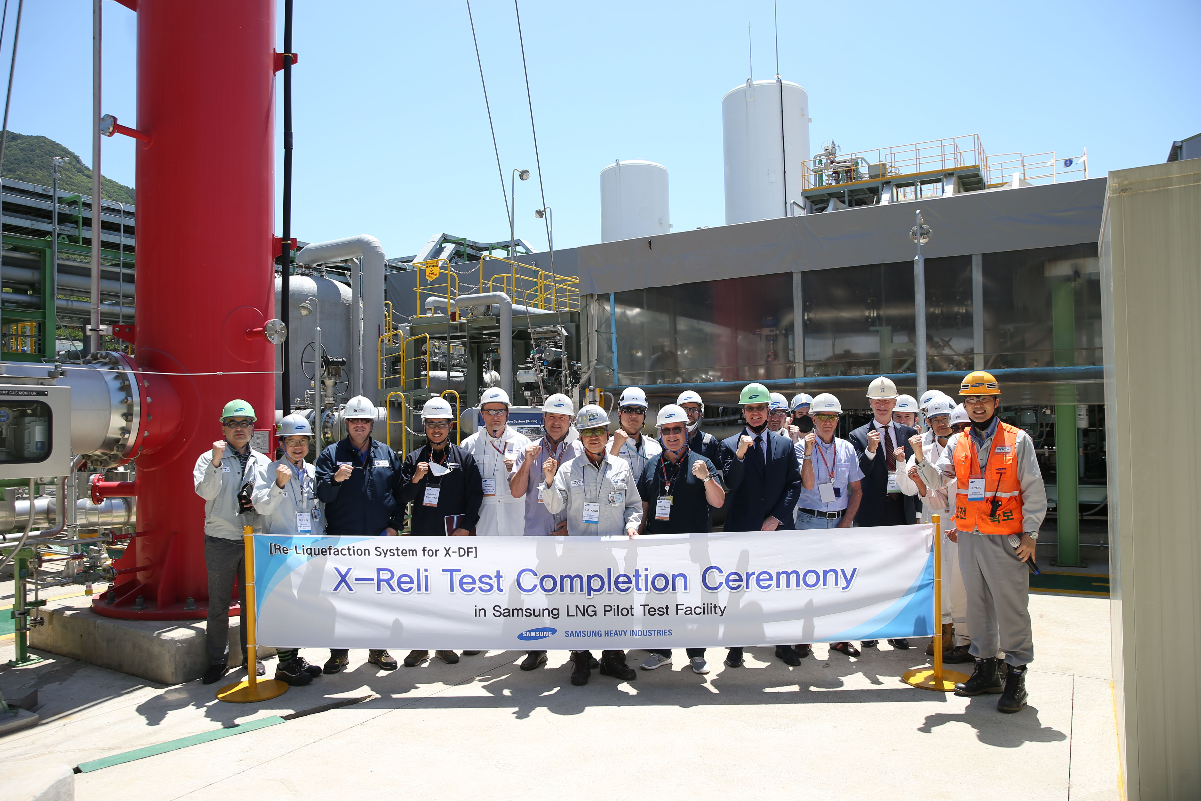 삼성重, 독자개발 LNG 재액화시스템 실증 성공 - 주요 선주·선급 참관 … 실제 장비에서 성능 검증 성공 · 별도 냉매없는 저압냉각공정 특허 적용, 핵심부품 국산화 - 온실가스 배출 저감 … LNG운반선 수주 경쟁력 확보 기여 □ 삼성중공업은 거제조선소 LNG 실증설비에서 독자 기술로 개발한 저압 이중가스엔진(X-DF)용 LNG 재액화시스템인 '엑스-렐리(X-Reli)'의 성능 검증에 성공했다고 2일 밝힘. 이날 테스트에는 말레이시아 국영 선사인 MISC를 비롯해 그리스 미네르바(Minerva), ABS, KR 등 주요 선사 및 선급 관계자들이 대거 참석해 신제품에 대한 관심을 높였음. □ LNG 재액화시스템인 '엑스-렐리'는 영하 163도의 극저온 화물창에서 자연 기화되는 LNG 증발 가스(Boil ..