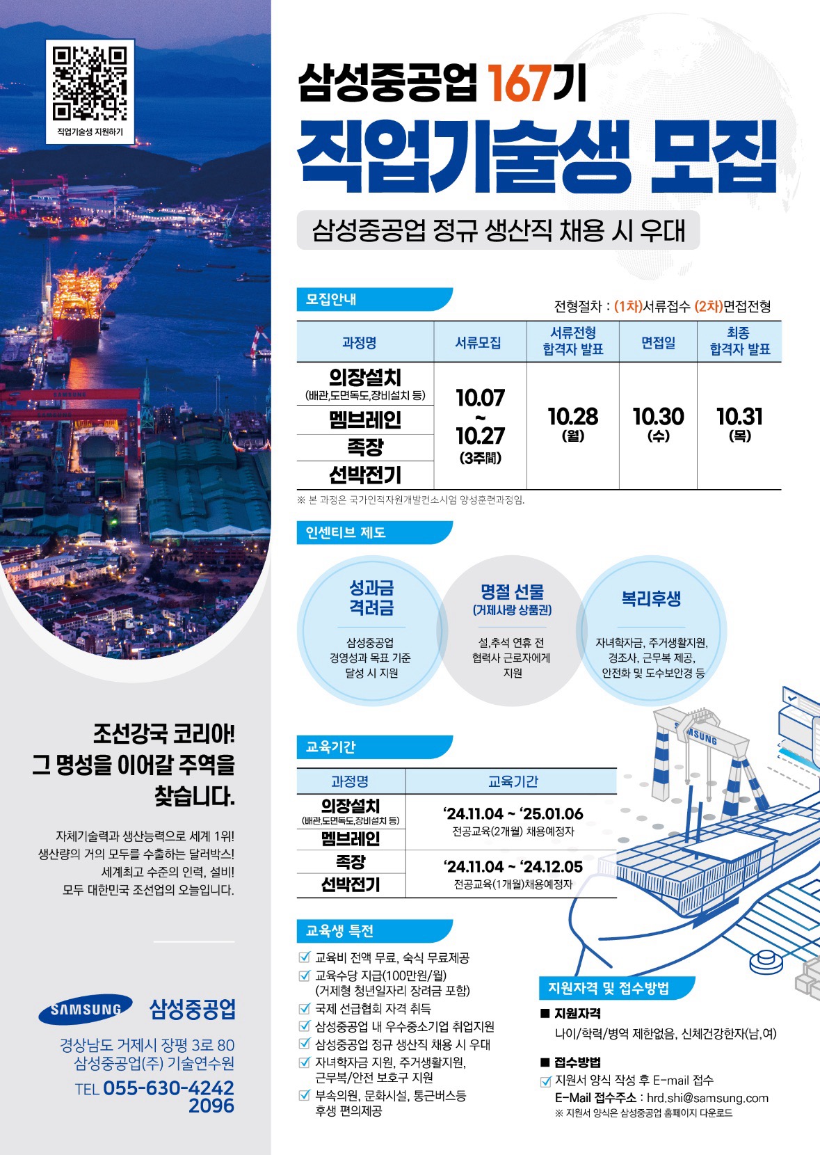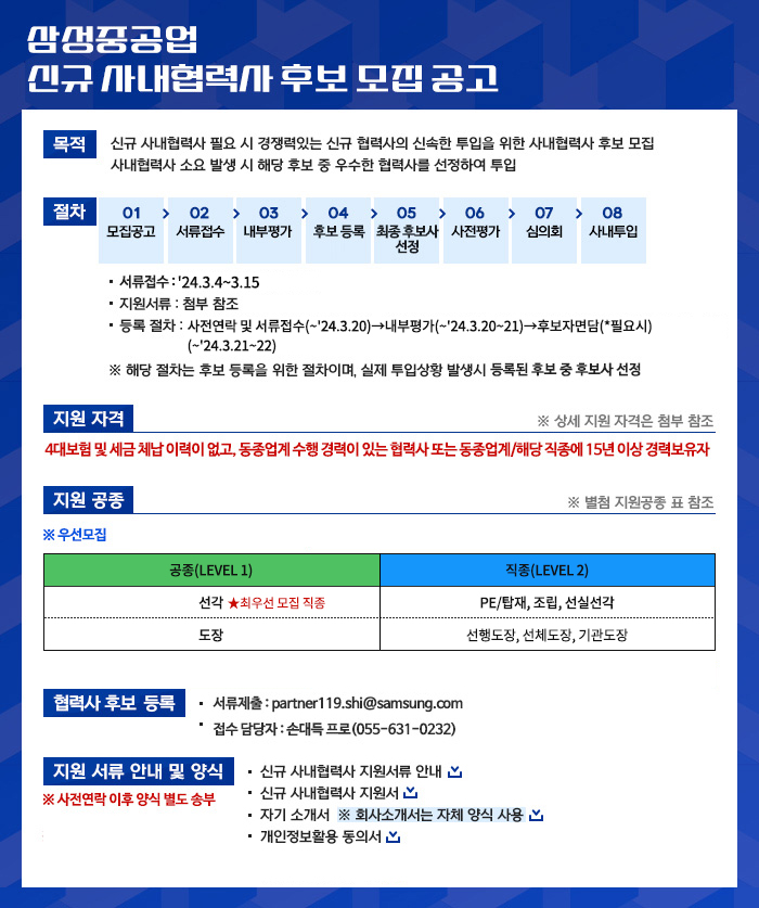 2024년 삼성중공업 생산직 채용 □ 모집 기간: 5/13(월) ~ 5/21(화)□ 삼성채용 홈페이지 바로가기 링크 참조: https://www.samsungcareers.com/hr/?no=16585 SAMSUNG CAREERS원활한 홈페이지 이용을 위해 최신 브라우저로 업데이트해주세요. 업데이트 하러 가기www.samsungcareers.com SHI 이야기/- SHI 채용 2024.05.13